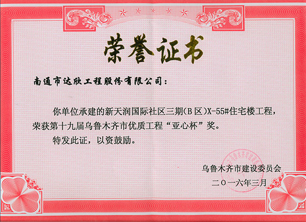 另訊,由我工程公司承建的新天潤(rùn)國(guó)際社區(qū)三期(B區(qū))X-55#住宅樓工程,榮獲第十九屆烏魯木齊市優(yōu)質(zhì)工程“亞心杯”獎(jiǎng)。