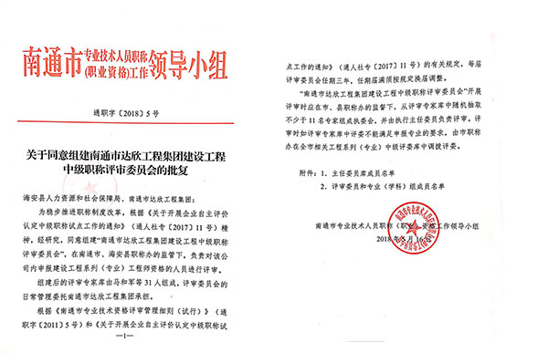 自2018年起,達欣集團將在縣、市職稱辦的領(lǐng)導(dǎo)下,自主對本公司內(nèi)申報國家級建設(shè)工程系列(專業(yè))工程師資格的人員進行評審。只要符合中級職稱申報條件,均可在南通職稱網(wǎng)通過“南通市達欣工程集團建設(shè)工程中級專業(yè)技術(shù)資格評審委員會”進行申報。此次公司獲得中級職稱自主評價認定資格,既是上級主管部門對公司人才管理工作的肯定,也是公司近年來重視實施人才戰(zhàn)略,加快人才引進與培養(yǎng),企業(yè)技術(shù)人員綜合素養(yǎng)水平能力不斷提高的有效體現(xiàn)