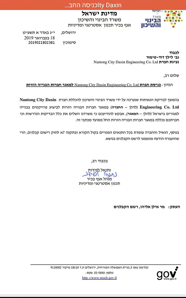 近年來,達(dá)欣集團(tuán)積極響應(yīng)國家“走出去”和“一帶一路”戰(zhàn)略,大力發(fā)展國際工程承包業(yè)務(wù),此次中標(biāo)以色列承包商資格,將為集團(tuán)進(jìn)一步拓展海外市場提供新的契機(jī)。