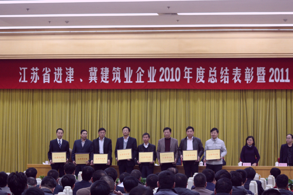 2011年3月20日,江蘇省進津、冀建筑業(yè)企業(yè)2010年度總結(jié)表彰暨2011年工作大會在天津大禮堂隆重召開。大會由江蘇省建設(shè)廳駐天津辦事處副主任韓勁松主持,主任鄧福林作了“搶抓新機遇,謀劃新發(fā)展,不斷開創(chuàng)江蘇建筑業(yè)新局面”的工作報告,對2010年的工作進行回顧,并提出2011年工作目標任務。江蘇省建筑工程管理局副局長紀迅、天津市外地施工隊伍管理站站長吳海、江蘇省住房和城鄉(xiāng)建設(shè)廳監(jiān)察室主任王毅、計劃賬務處調(diào)研員徐和美等江蘇省、天津市的主管部門領(lǐng)導應邀出席了會議,紀迅局長、吳海站長作了重要講話。