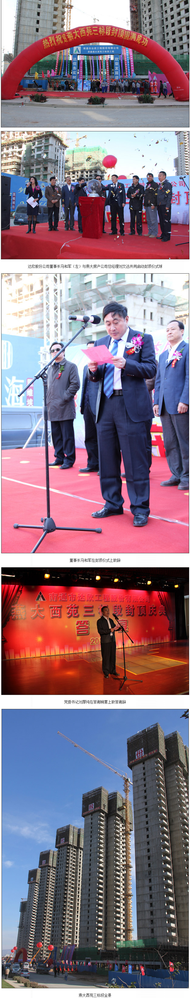 2009年11月10日,我公司承建的河北省秦皇島市燕大西苑三標(biāo)段工程(5棟框剪結(jié)構(gòu)住宅樓及地下車庫(kù)、商業(yè),地上34層,地下2層,總建筑面積96151㎡)在燕大房地產(chǎn)開發(fā)有限公司負(fù)責(zé)人刑廣忠的一聲號(hào)令下啟動(dòng)了開工儀式,2010年11月8日,由我公司董事長(zhǎng)馬和軍與燕大房地產(chǎn)開發(fā)有限公司總經(jīng)理劉文遠(yuǎn)共同啟動(dòng)封頂儀式球,宣布燕大西苑三標(biāo)段提前圓滿封頂。
