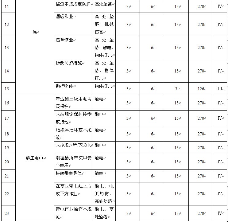 根據(jù)實(shí)際情況施工現(xiàn)場(chǎng)可能造成的危害為:高處墜落、物體打擊、起重傷害、機(jī)械傷害、觸電和火災(zāi)等。針對(duì)以上可能造成的危害建立危險(xiǎn)源登記,根據(jù)危險(xiǎn)源的等級(jí)及危害程度,制訂控制實(shí)施辦法。