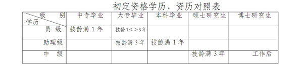 1、初定條件:大中專畢業(yè)生在所學(xué)專業(yè)與所從事工作的專業(yè)相同或相近的前提下,具備以下國家規(guī)定的相應(yīng)學(xué)歷、從事專業(yè)技術(shù)工作年限(表中簡稱“技齡”)的,可申請(qǐng)初定相應(yīng)級(jí)別的專業(yè)技術(shù)資格: